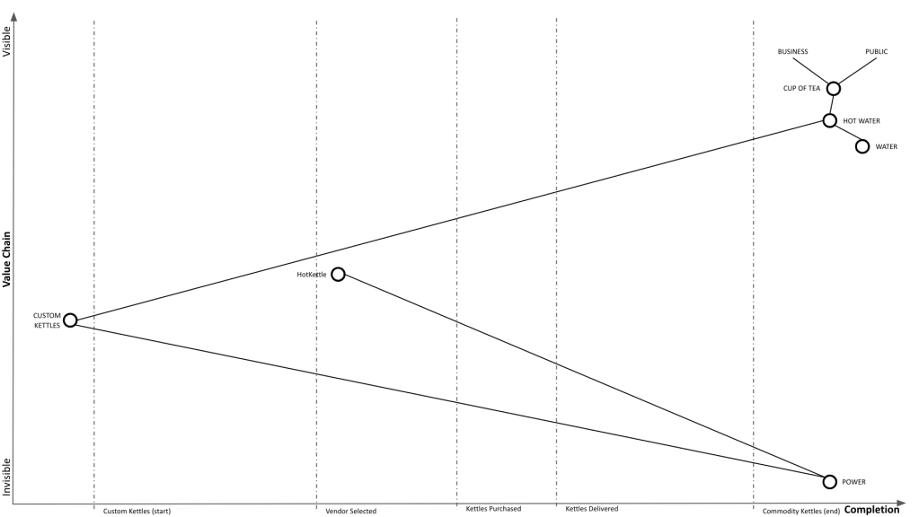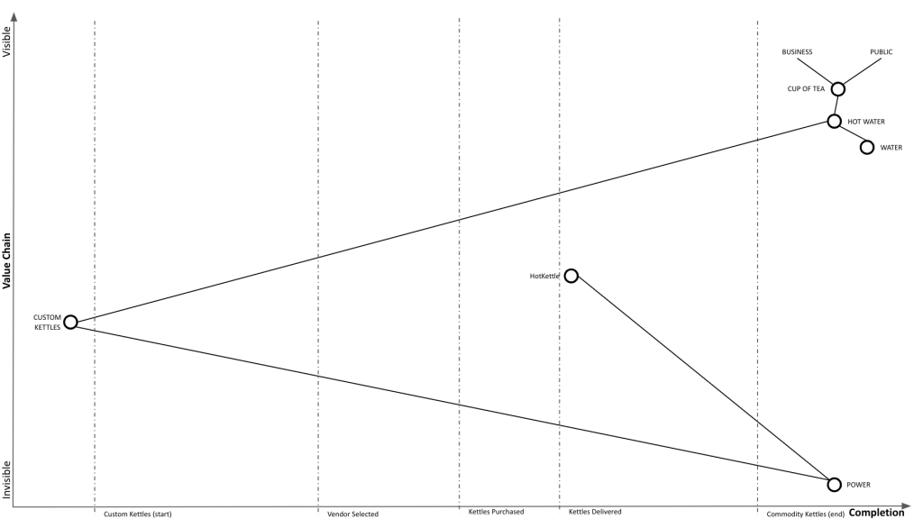 Phase Line Mapping attempts to bring topographical intelligence to project management, similarly as to how Wardley Mapping brought topographical intelligence to business strategy. Taking the classic tea shop Wardley Map, let’s assume we decided to replace the custom kettles we’re building with a supply of commodity kettles.