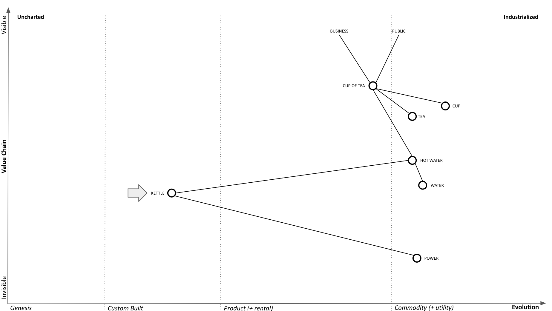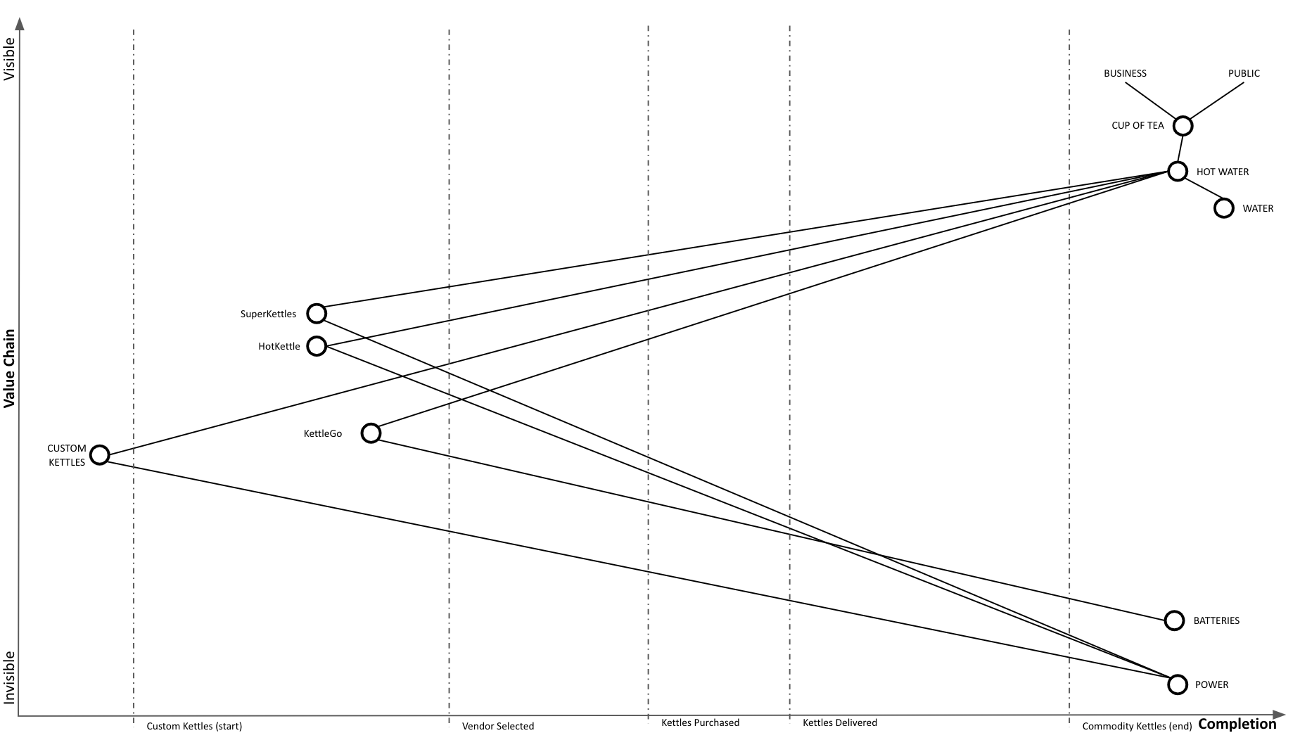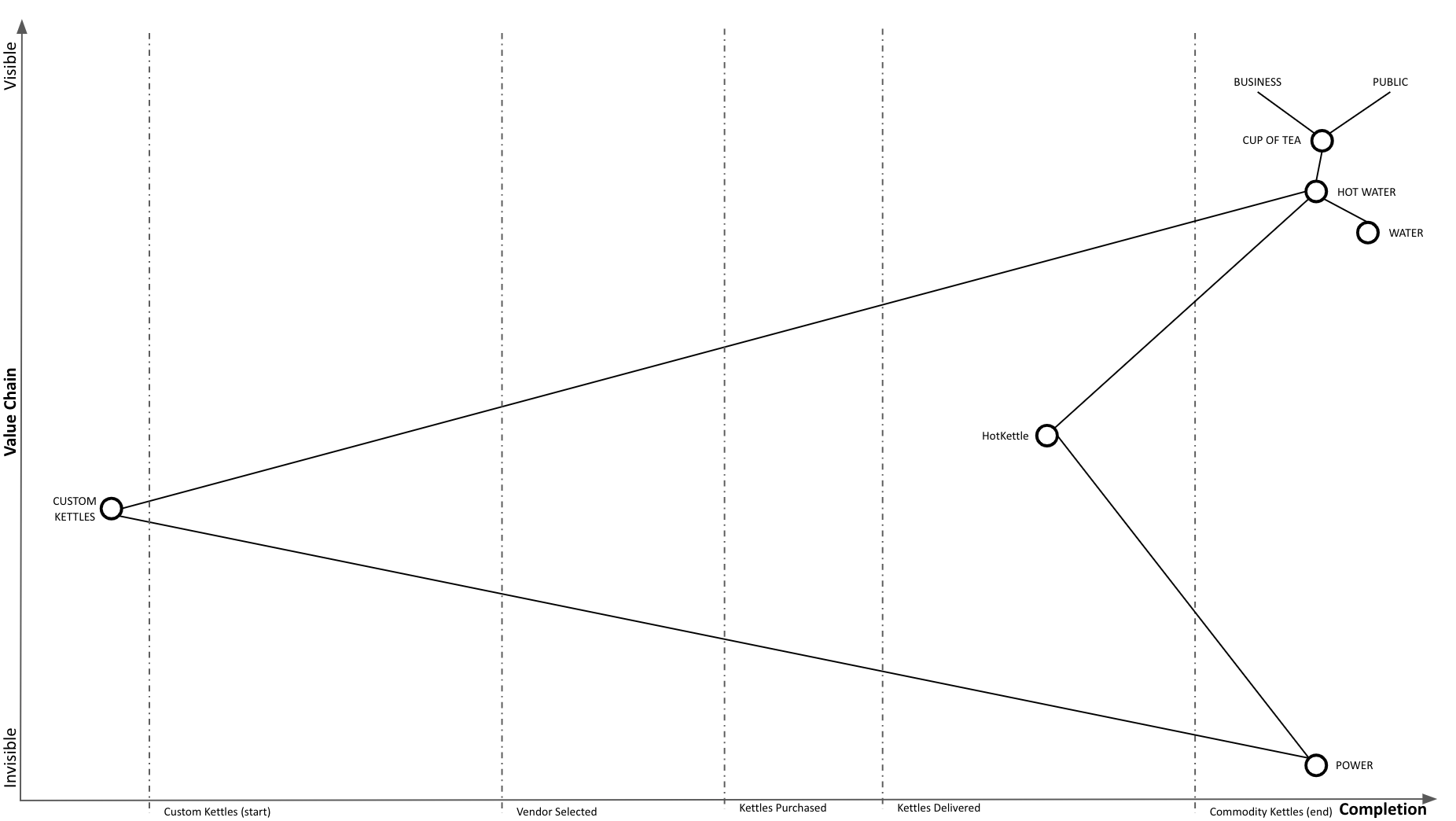 Phase Line Mapping attempts to bring topographical intelligence to project management, similarly as to how Wardley Mapping brought topographical intelligence to business strategy. Taking the classic tea shop Wardley Map, let’s assume we decided to replace the custom kettles we’re building with a supply of commodity kettles.